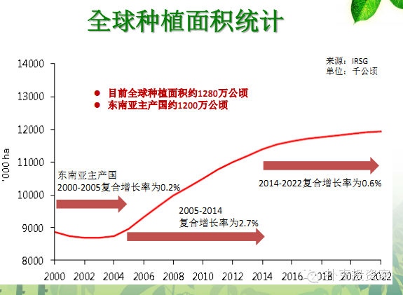 全球種植概況目前全球總種植面積約1280萬公頃,其中東南亞約1200萬公頃;